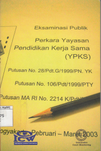 Buku ini pada dasarnya merupakan dokumentasi hasil kegiatan eksaminasi publik (sebagai suatu kegiatan yang melibatkan partisipasi masyarakat dalam melakukan pengawasan terhadap jalannya peradilan) yang telah dilakukan di Yogyakarta terhadap Perkara Yayasan Pendidikan Kerja Sama (YPKS) Yogyakarta.